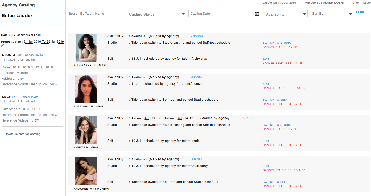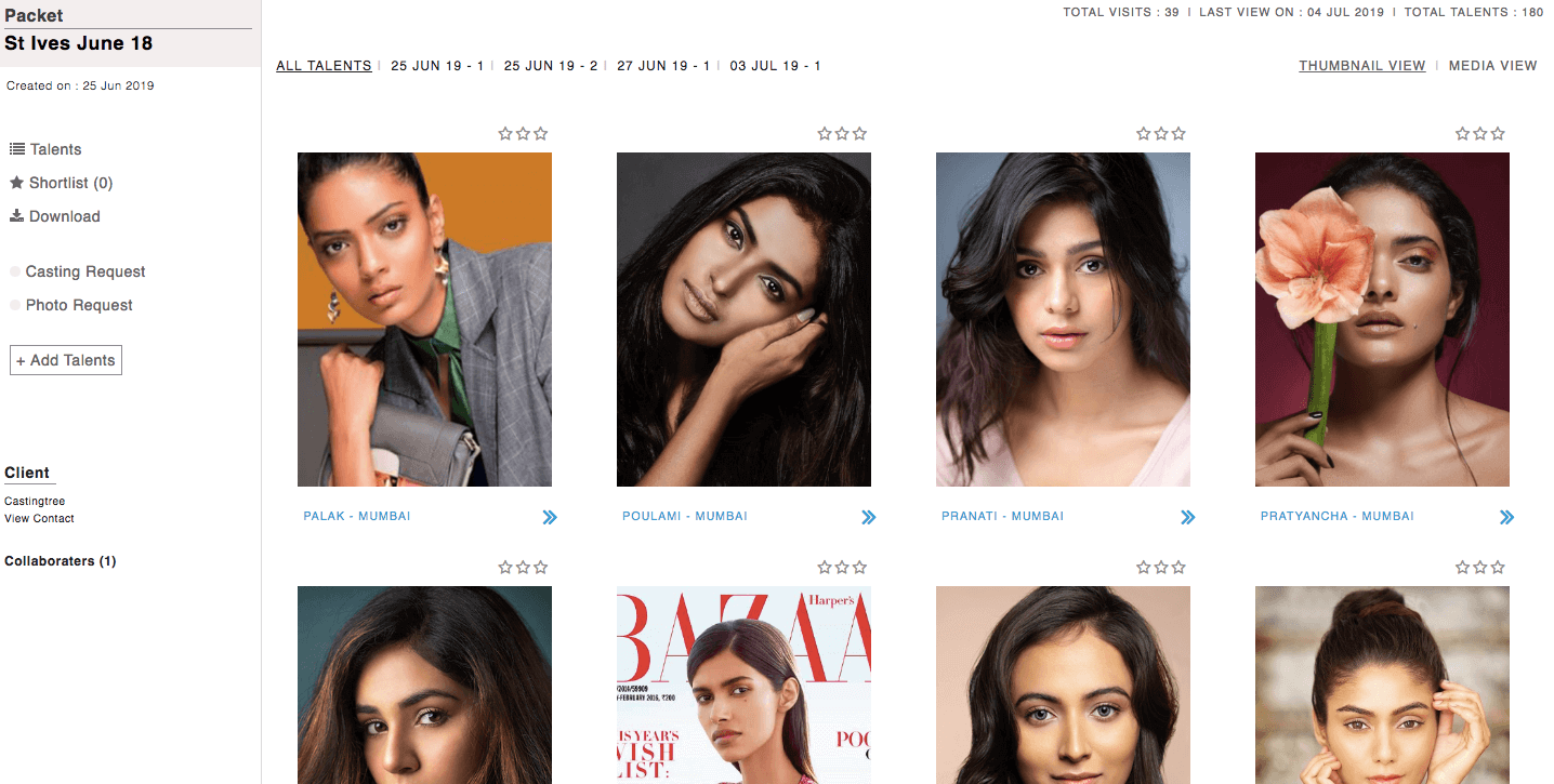 Filter talents-profile with availablity and tags, add them to packet and share with clients. Client can shortlist, download entire packet or selected media. Also link packet to casting-board.